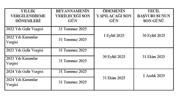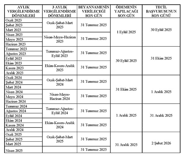 Borçluların bu imkandan yararlanabilmeleri, ödeme süreleri bu Sirkülerin ekinde yer alan tablolarda belirlenen alacaklar için tablolarda belirlenmiş sürelerde, diğer amme alacakları için ise 31/7/2025 tarihine kadar başvuruda bulunmaları halinde mümkündür.