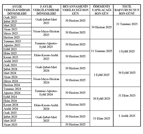 Bu sirküler kapsamında mücbir sebep hali 31/5/2025 tarihine uzatılan mükelleflerin beyanname ve bildirim verme, bu beyanname ve bildirimler üzerine tahakkuk eden vergilerin ödeme süreleri ile bu vergilere ilişkin tecil başvuru süreleri bu Sirkülerin ekinde yer alan tablolarda [e-Defter ve berat dosyaları için bu Sirkülerin (3) numaralı bölümünde] belirlenmiştir.