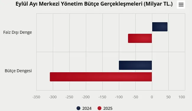 2025 yılı Eylül ayında merkezi yönetim bütçe giderleri 1 trilyon 331 milyar TL, bütçe gelirleri 1 trilyon 21,4 milyar TL ve bütçe açığı 309,6 milyar TL olarak gerçekleşmiştir. Ayrıca, faiz dışı bütçe giderleri 1 trilyon 94,4 milyar TL ve faiz dışı açık ise 73 milyar TL olarak gerçekleşmiştir.