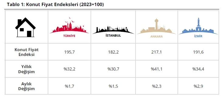2025 yılı Eylül ayında, İstanbul, Ankara ve İzmir’de bir önceki aya göre, sırasıyla yüzde 1,5, 2,3 ve 2,9 oranlarında artış gözlenmiştir. Endeks değerleri bir önceki yılın aynı ayına göre, İstanbul, Ankara ve İzmir’de sırasıyla yüzde 30,7, 41,1 ve 34,4 oranlarında artış göstermiştir.