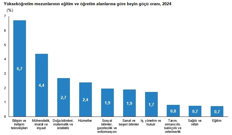 En yüksek beyin göçü oranına sahip eğitim ve öğretim alanları bilişim ve iletişim teknolojileri (%6,7), mühendislik, imalat ve inşaat (%4,4) ve doğa bilimleri, matematik ve istatistik (%2,7) oldu.
