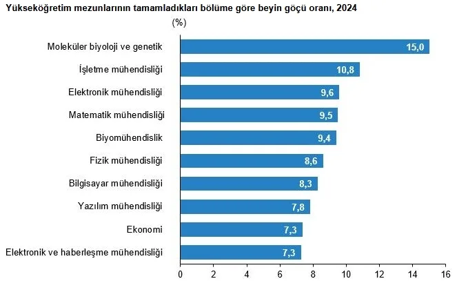 Mezunların beyin göçü oranları incelendiğinde, en yüksek beyin göçü oranına sahip lisans programları sırasıyla, moleküler biyoloji ve genetik (%15,0), işletme mühendisliği (%10,8), elektronik mühendisliği (%9,6), matematik mühendisliği (%9,5) ve biyomühendislik (%9,4) oldu.
