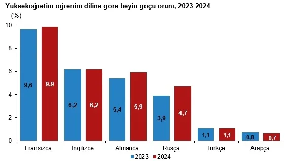 Öğrenim diline göre mezunların beyin göçü oranları incelendiğinde, Fransızca eğitim alan mezunlar %9,9 ile en yüksek beyin göçü oranına sahip oldu. Fransızcayı, İngilizce (%6,2), Almanca (%5,9) ve Rusça (%4,7) takip etti.