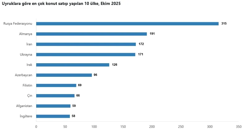 Ekim ayında ülke uyruklarına göre en fazla konut satışı sırasıyla 315 ile Rusya Federasyonu, 191 ile Almanya ve 172 ile İran vatandaşlarına yapıldı.