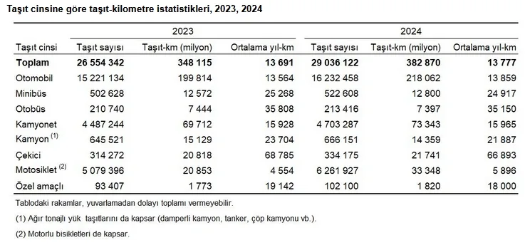 Taşıtların bir yılda yaptıkları ortalama kilometreler incelendiğinde; 2024 yılında sırasıyla çekicilerin 66 bin 893, otobüslerin 35 bin 150, minibüslerin 24 bin 917, kamyonların 21 bin 887, özel amaçlı taşıtların 18 bin, kamyonetlerin 15 bin 965, otomobillerin 13 bin 859 ve motosikletlerin 5 bin 896 kilometre yaptığı hesaplandı.