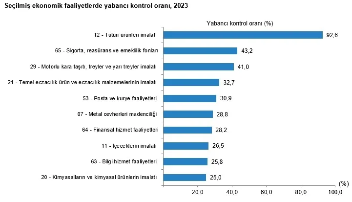 Tütün ürünleri imalatı, 2023 yılında yabancı kontrollü girişimlerin ciro payının %92,6 ile en yüksek olduğu faaliyet oldu. Yabancı kontrollü girişimlerin ciro payının en yüksek olduğu ikinci faaliyet ise %43,2 ile sigorta, reasürans ve emeklilik fonları oldu.