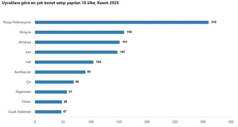 Kasım ayında ülke uyruklarına göre en fazla konut satışı sırasıyla 310 ile Rusya Federasyonu, 159 ile Ukrayna ve 151 ile Almanya vatandaşlarına yapıldı.