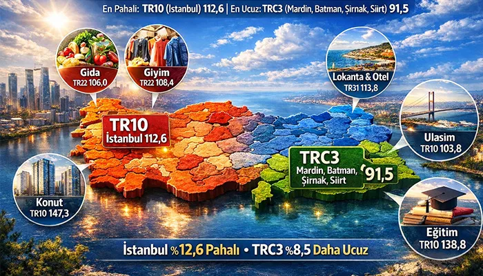 Türkiye’nin 2024 yılı sonuçlarına göre fiyat düzeyi endeksi en yüksek bölgesi 112,6 ile TR10 (İstanbul), en düşük bölgesi ise 91,5 ile TRC3 (Mardin, Batman, Şırnak, Siirt) oldu. Bu endeks değerleri, TR10 (İstanbul)’un Türkiye ortalamasına göre %12,6 pahalı, TRC3 (Mardin, Batman, Şırnak, Siirt)’ün ise %8,5 daha ucuz olduğunu göstermiştir.