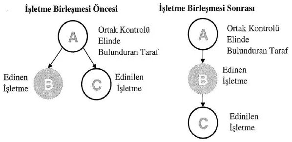 Edinilen işletme, ortak kontrol altındaki bir taraftan diğer bir tarafa devredilen işletmeyi ifade etmektedir. Yukarıda yer alan şemadaki C İşletmesi edinilen işletme olarak nitelendirilir. Edinen işletme; edinilen işletmeyi, ortak kontrol altındaki bir taraftan devralan işletmeyi ifade etmektedir. Yukarıda yer alan şemadaki B İşletmesi edinen işletme olarak nitelendirilir. Ortak kontrolü elinde bulunduran taraf ise birleşmenin öncesinde ve sonrasında birleşen işletmelerin tamamını kontrol eden taraftır. Yukarıda yer alan şemadaki A tarafı, ortak kontrolü elinde bulunduran taraf olarak nitelendirilir.