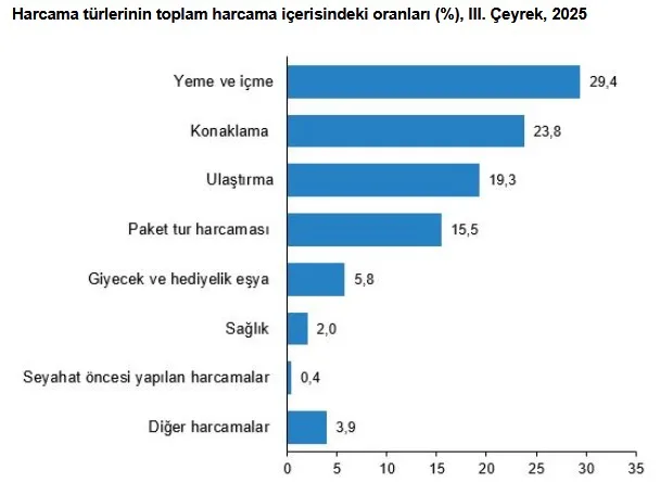 Bu çeyrekte harcama türlerinin toplam seyahat harcamaları içinde dağılım oranları incelendiğinde en fazla paya %29,4 ile yeme ve içme harcamaları, %23,8 ile konaklama harcamaları ve %19,3 ile ulaştırma harcamaları sahip oldu. Bu harcama türlerinin geçen yılın aynı dönemine göre değişim oranları incelendiğinde ise yeme ve içme harcamalarında %31,6, konaklama harcamalarında %54,6 ve ulaştırma harcamalarında ise %25,7’lik artış görüldü.