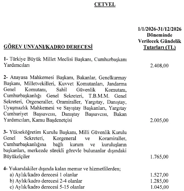 MADDE 1– (1) Kuzey Kıbrıs Türk Cumhuriyeti’ne sürekli veya geçici bir görevle gönderilenlerin, gidiş ve dönüşleri ile geçici görevlendirme süreleri için verilecek gündelik tutarları ekli cetvelde gösterilmiştir.
