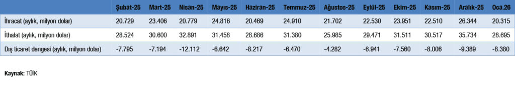 - 2026 yılı Ocak ayında dış ticaret açığı bir önceki yılın aynı ayına göre yüzde 11,6 oranında artarak 8,4 milyar dolar seviyesinde kaydedilmiştir. 2026 yılı Ocak ayı itibarıyla yıllıklandırılmış dış ticaret açığı ise bir önceki yılın aynı dönemine göre yüzde 11,3 oranında artarak 93 milyar dolar seviyesinde gerçekleşmiştir.