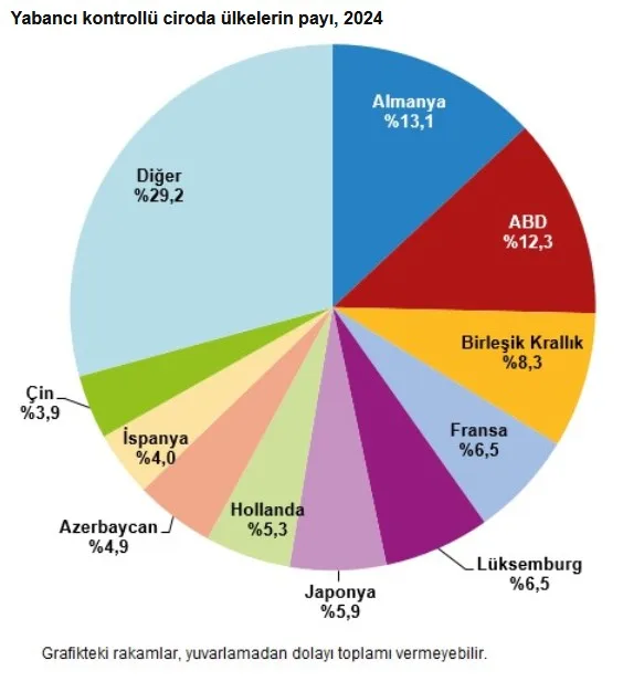Yabancı kontrollü 11 bin 86 girişimden bin 309 tanesi Almanya tarafından kontrol edildi. Almanya tarafından kontrol edilen girişimlerin 2024 yılında elde ettiği cironun toplam yabancı kontrollü cirodaki payı %13,1 oldu. ABD kontrolündeki bin 10 girişimin toplam yabancı kontrollü cirodaki payı %12,3 iken Birleşik Krallık kontrolündeki 737 girişimin yabancı kontrollü cirodaki payı ise %8,3 olarak gerçekleşti.