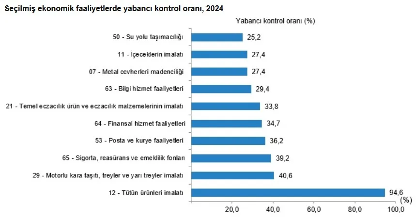 Tütün ürünleri imalatı, 2024 yılında yabancı kontrollü girişimlerin ciro payının %94,6 ile en yüksek olduğu faaliyet oldu. Yabancı kontrollü girişimlerin ciro payının en yüksek olduğu ikinci faaliyet ise %40,6 ile Motorlu kara taşıtı, treyler (römork) ve yarı treyler (yarı römork) imalatı oldu.
