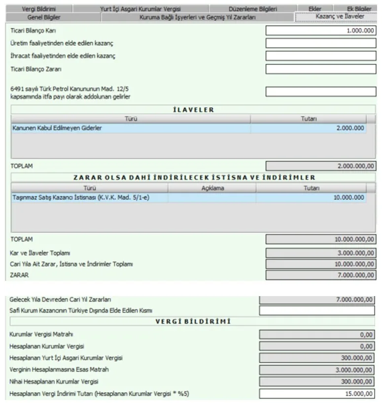 - KVK’nın 32/C maddesinde asgari kurumlar vergisi hesaplanırken kazançtan düşülecek istisna ve indirimler arasında KVK’nın 5/1-e maddesinde düzenlenen istisna yer almadığından ve istisnanın satışın yapıldığı dönemde uygulanması gerektiğinden, zarar ya da asgari kurumlar vergisi sebebiyle istisnadan tamamen yararlanılamaması halinde dahi istisna tutara beyannamenin “Zarar Olsa Dahi İndirilecek İstisna ve İndirimler” bölümünün ilgili satırında yer verilerek yararlanılamayan kısmın “Gelecek Yıla Devreden Cari Yıl Zararları” satırında gelecek yıllara, zarar olarak devredilmesi gerekmektedir.