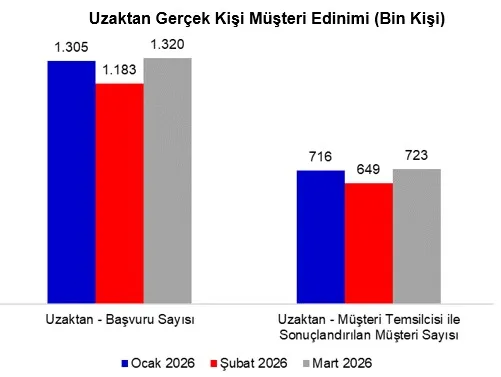 Mart 2026 itibarıyla uzaktan başvuru yoluyla edinilen gerçek kişi müşteri sayısı 1 milyon 320 bin olmuştur. Bu edinimlerden yaklaşık 723 bini müşteri temsilcisi ile sonuçlandırılmıştır.